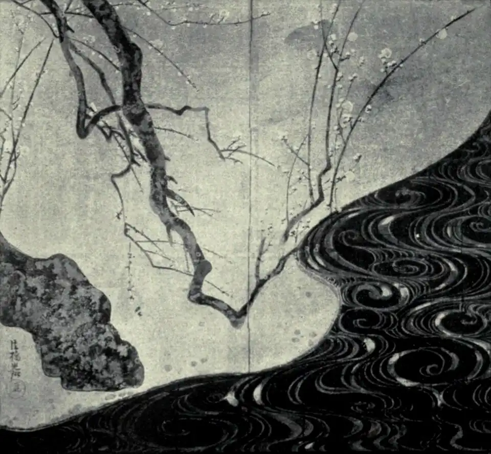 Fig. 9.—PLUM TREES AND STREAM—SCREEN ON GOLD GROUND. By Korin (1661–1716).