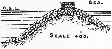 Jetties at Entrances to Jetty Harbours.—The approach channel to some ports situated on sandy coasts is guided and protected across the beach by parallel jetties, made solid up to a little above low water of neap tides, on which open timber-work is erected, provided with a planked platform at the top raised above the highest tides. The channel between the jetties was originally maintained by tidal scour from low-lying areas close to the coast, and subsequently by the current from sluicing basins; but it is now often considerably deepened by sand-pump dredging. It is protected to some extent by the solid portion of the jetties from the inroad of sand from the adjacent beach, and from the levelling action of the waves; whilst the upper open portion serves to indicate the channel, and to guide the vessels if necessary (see Harbour). The bottom part of the older jetties, in such long-established jetty ports as Calais, Dunkirk and Ostend, was composed of clay or rubble stone, covered on the top by fascine-work or pitching; but the deepening of the jetty channel by dredging, and the need which arose for its enlargement, led to the reconstruction of the jetties at these ports. The new jetties at Dunkirk were founded in the sandy beach, by the aid of compressed air, at a depth of 223/4 ft. below low water of spring tides; and their solid masonry portion, on a concrete foundation, was raised 53/5 ft. above low water of neap tides (fig. 2).