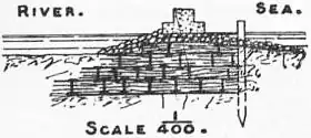 Jetties at the Mouth of Tidal Rivers.—Where a river is narrow near its mouth, and its discharge is generally feeble, the sea is liable on an exposed coast, when the tidal range is small, to block up its outlet during severe storms. The river is thus forced to seek another exit at a weak spot of the beach, which along a low coast may be at some distance off; and this new outlet in its turn may be blocked up, so that the river from time to time shifts the position of its mouth. This inconvenient cycle of changes may be stopped by fixing the outlet of the river at a suitable site, by carrying a jetty on each side of this outlet across the beach, thereby concentrating its discharge in a definite channel and protecting the mouth from being blocked up by littoral drift. This system was long ago applied to the shifting outlet of the river Yare to the south of Yarmouth, and has also been successfully employed for fixing the wandering mouth of the Adur near Shoreham, and of the Adour flowing into the Bay of Biscay below Bayonne. When a new channel was cut across the Hook of Holland to provide a straighter and deeper outlet channel for the river Maas, forming the approach channel to Rotterdam, low, broad, parallel jetties, composed of fascine mattresses weighted with stone (fig. 5), were carried across the foreshore into the sea on either side of the new mouth of the river, to protect the jetty channel from littoral drift, and cause the discharge of the river to maintain it out to deep water (see River Engineering). The channel, also, beyond the outlet of the river Nervion into the Bay of Biscay has been regulated by jetties; and by extending the south-west jetty out for nearly half a mile with a curve concave towards the channel the outlet has not only been protected to some extent from the easterly drift, but the bar in front has been lowered by the scour produced by the discharge of the river following the concave bend of the south-west jetty. As the outer portion of this jetty was exposed to westerly storms from the Bay of Biscay before the outer harbour was constructed, it has been given the form and strength of a breakwater situated in shallow water (fig. 6). (L. F. V.-H.)