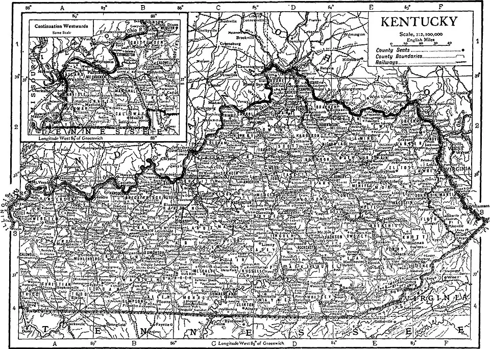 Bibliography.—For descriptions of physical features and accounts of natural resources see Reports of the Kentucky Geological Survey, the Biennial Reports of the Bureau of Agriculture, Labor and Statistics, the Reports of the United States Census and various publications of the U.S. Geological Survey, and other publications listed in Bulletin 301 (Bibliography and Index of North American Geology for 1901–1905) and other bibliographies of the Survey. For an early description, see Gilbert Imlay, A Topographical Description of the Western Territory of North America (London, 3rd ed., 1797), in which John Filson’s “Discovery, Settlement and Present State of Kentucke” (1784) is reprinted. For a brief description of the Blue Grass Region, see James Lane Allen’s The Blue Grass Region of Kentucky and other Kentucky Articles (New York, 1900). An account of the social and industrial life of the people in the “mountain” districts is given in William H. Haney’s The Mountain People of Kentucky (Cincinnati, 1906). For administration, see the Official Manual for the Use of the Courts, State and County Officials and General Assembly of the State of Kentucky (Lexington), which contains the Constitution of 1891; The Report of the Debates and Proceedings of the Convention . . . of 1849 (Frankfort, 1849); The Official Report of the Proceedings and Debates of the Constitutional Convention of 1890 (4 vols., Frankfort, 1890); B. H. Young, History and Texts of Three Constitutions of Kentucky (Louisville, 1890); J. F. Bullitt and John Feland, The General Statutes of Kentucky (Frankfort and Louisville, 1877, revised editions, 1881, 1887); and the Annual Reports of state officers and boards. For history see R. M. McElroy’s Kentucky in the Nation’s History (New York, 1909, with bibliography); or (more briefly) N. S. Shaler’s Kentucky (Boston, 1885), in the American Commonwealths Series. John M. Brown’s The Political Beginnings of Kentucky (Louisville, 1889) is a good monograph dealing with the period before 1792; it should be compared with Thomas M. Green’s The Spanish Conspiracy: A Review of Early Spanish Movements in the Southwest (Cincinnati, 1891), written in reply to it. Among older histories are Humphrey Marshall, The History of Kentucky . . . and the Present State of the Country (2 vols., Frankfort, 1812, 1824), extremely Federalistic in tone; Mann Butler, History of Kentucky from its Exploration and Settlement by the Whites to the close of the Southwestern Campaign of 1813 (Louisville, 1834; 2nd ed., Cincinnati, 1836), and Lewis Collins, The History of Kentucky (2 vols., revised edition, Covington, Ky., 1874), a valuable store-house of facts, the basis of Shaler’s work. E. D. Warfield’s The Kentucky Resolutions of 1798 (New York, 2nd ed., 1887) is an excellent monograph. For the Civil War history see “Campaigns in Kentucky and Tennessee,” in the 7th volume of Papers of the Military Historical Society of Massachusetts (Boston, 1908); Thomas Speed, The Union Cause in Kentucky (New York, 1907); Basil W. Duke, History of Morgan’s Cavalry (Cincinnati, 1867), and general works on the history of the war. See also Alvin F. Lewis, History of Higher Education in Kentucky, in Circulars of Information of the U.S. Bureau of Education (Washington, 1899), and R. G. Thwaites, Daniel Boone (New York, 1902). There is much valuable material in the Register (Frankfort, 1903 seq.) of the Kentucky State Historical Society, and especially in the publications of the Filson Club of Louisville. Among the latter are R. T. Durrett’s John Filson, the first Historian of Kentucky (1884); Thomas Speed, The Wilderness Road (1886); W. H. Perrin, The Pioneer Press of Kentucky (1888); G. W. Ranck, Boonesborough: Its Founding, Pioneer Struggles, Indian Experiences, Transylvania Days and Revolutionary Annals (1901), and The Centenary of Kentucky (1892), containing an address, “The State of Kentucky: its Discovery, Settlement, Autonomy and Progress in a Hundred Years,” by Reuben T. Durrett.