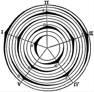 Fig. 30.—A stem with alternate leaves, arranged in a pentastichous or quincuncial manner. The sixth leaf is directly above the first, and commences the second cycle. The fraction of the circumference of the stem expressing the divergence of the leaves is two-fifths. |