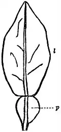 Fig. 21.—Leaf of Orange (Citrus Aurantium), showing a winged leafy petiole p, which is articulated to the lamina l. |