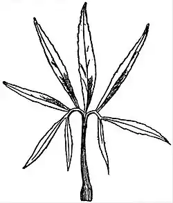 Compound leaves are those in which the divisions extend to the midrib or petiole, and the separated portions become each articulated with it, and receive the name of leaflets. The midrib, or petiole, has thus the appearance of a branch with separate leaves attached to it, but it is considered properly as one Compound leaves. leaf, because in its earliest state it arises from the axis as a single piece, and its subsequent divisions in the form of leaflets are all in one plane. The leaflets are either sessile (fig. 18) or have stalks, called petiolules (fig. 19). Compound leaves are pinnate (fig. 19) or palmate (fig. 18) according to the arrangement of leaflets. When a pinnate leaf ends in a pair of pinnae it is equally or abruptly pinnate (paripinnate); when there is a single terminal leaflet (fig. 19), the leaf is unequally pinnate (imparipinnate); when the leaflets or pinnae are placed alternately on either side of the midrib, and not directly opposite to each other, the leaf is alternately pinnate; and when the pinnae are of different sizes, the leaf is interruptedly pinnate. When the division is carried into the second degree, and the pinnae of a compound leaf are themselves pinnately compound, a bipinnate leaf is formed.
