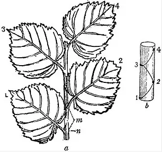 In their arrangement leaves follow a definite order. The points on the stem at which leaves appear are called nodes; the part of the stem between the nodes is the internode. When two leaves are produced at the same node, one on each side of the stem or axis, and at the same level, they are opposite (fig. 29); when more than two are produced they are verticillate, and the circle of leaves is then called a verticil or whorl. When leaves are opposite, each successive pair may be placed at right angles to the pair immediately preceding. They are then said to decussate, following thus a law of alternation (fig. 29). The same occurs in the verticillate arrangement, the leaves of each whorl rarely being superposed on those of the whorl next it, but usually alternating so that each leaf in a whorl occupies the space between two leaves of the whorl next to it. There are considerable irregularities, however, in this respect, and the number of leaves in different whorls is not always uniform, as may be seen in Lysimachia vulgaris. When a single leaf is produced at a node, and the nodes are separated so that each leaf is placed at a different height on the stem, the leaves are alternate (fig. 30). A plane passing through the point of insertion of the leaf in the node, dividing the leaf into similar halves, is the median plane of the leaf; and when the leaves are arranged alternately on an axis so that their median planes coincide they form a straight row or orthostichy. On every axis there are usually two or more orthostichies. In fig. 31, leaf 1 arises from a node n; leaf 2 is separated from it by an internode m, and is placed to the right or left; while leaf 3 is situated directly above leaf 1. In this case, then, there are two orthostichies, and the arrangement is said to be distichous. When the fourth leaf is directly above the first, the arrangement is tristichous. The same arrangement continues throughout the branch, so that in the latter case the 7th leaf is above the 4th, the 10th above the 7th; also the 5th above the 2nd, the 6th above the 3rd and so on. The size of the angle between the median planes of two consecutive leaves in an alternate arrangement is their divergence; and it is expressed in fractions of the circumference of the axis which is supposed to be a circle. In a regularly-formed straight branch covered with leaves, if a thread is passed from one to the other, turning always in the same direction, a spiral is described, and a certain number of leaves and of complete turns occur before reaching the leaf directly above that from which the enumeration commenced. If this arrangement is expressed by a fraction, the numerator of which indicates the number of turns, and the denominator the number of internodes in the spiral cycle, the fraction will be found to represent the angle of divergence of the consecutive leaves on the axis. Thus, in fig. 32, a, b, the cycle consists of five leaves, the 6th leaf being placed vertically over the 1st, the 7th over the 2nd and so on; while the number of turns between the 1st and 6th leaf is two; hence this arrangement is indicated by the fraction 2/5. In other words, the distance or divergence between the first and second leaf, expressed in parts of a circle, is 2/5 of a circle or 360° × 2/5 = 144°. In fig. 31, a, b, the spiral is ½, i.e. one turn and two leaves; the third leaf being placed vertically over the first, and the divergence between the first and second leaf being one-half the circumference of a circle, 360° × ½ = 180°. Again, in a tristichous arrangement the number is ⅓, or one turn and three leaves, the angular divergence being 120°.