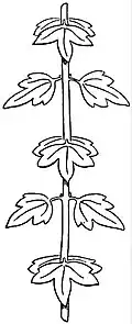 Fig. 29.—A stem with opposite leaves. The pairs are placed at right angles alternately, or in what is called a decussate manner. In the lowest pair one leaf is in front and the other at the back; in the second pair the leaves are placed laterally, and so on. |
