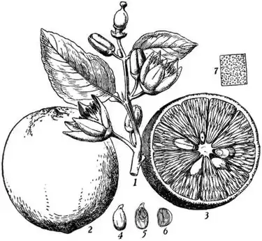 The lemon is more delicate than the orange, although, according to Humboldt, both require an annual mean temperature of 62° Fahr. Unlike the orange, which presents a fine close head of deep green foliage, it forms a straggling bush, or small tree, 10 to 12 ft. high, with paler, more scattered leaves, and short angular branches with sharp spines in the axils. The flowers, which possess a sweet odour quite distinct from that of the orange, are in part hermaphrodite and in part unisexual, the outside of the corolla having a purplish hue. The fruit, which is usually crowned with a nipple, consists of an outer rind or peel, the surface of which is more or less rough from the convex oil receptacles imbedded in it, and of a white inner rind, which is spongy and nearly tasteless, the whole of the interior of the fruit being filled with soft parenchymatous tissue, divided into about ten to twelve compartments, each generally containing two or three seeds. The white inner rind varies much in thickness in different kinds, but is never so thick as in the citron. As lemons are much more profitable to grow than oranges, on account of their keeping properties, and from their being less liable to injury during voyages, the cultivation of the lemon is preferred in Italy wherever it will succeed. In damp valleys it is liable like the orange (q.v.) to be attacked by a fungus sooty mould, the stem, leaves, and fruit becoming covered with a blackish dust. This is coincident with or subsequent to the attacks of a small oval brown insect, Chermes hesperidum. Trees not properly exposed to sunlight and air suffer most severely from these pests. Syringing with resin-wash or milk of lime when the young insects are hatched, and before they have fixed themselves to the plant, is a preventive. Since 1875 this fungoid disease has made great ravages in Sicily among the lemon and citron trees, especially around Catania and Messina. Heritte attributes the prevalence of the disease to the fact that the growers have induced an unnatural degree of fertility in the trees, permitting them to bear enormous crops year after year. This loss of vitality is in some measure met by grafting healthy scions of the lemon on the bitter orange, but trees so grafted do not bear fruit until they are eight or ten years old.