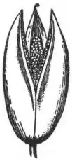 | Fig. 1.—Fruit or Capsule of Meadow Saffron (Colchicum autumnale) dehiscing along the septa. | Fig. 2.—Same cut across showing the three chambers with the seeds attached along the middle line—axile placentation. |