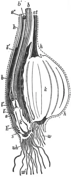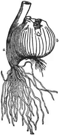 | Fig. 3.—Corm of Meadow Saffron (Colchicum autumnale). a, Old corm shrivelling; b, young corm produced laterally from the old one. | Fig. 4.—Corm of Colchicum autumnale in autumn when the plant is in flower. k,Present corm. |