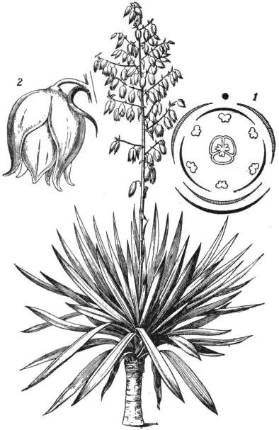 Fig. 5.—Yucca gloriosa. Plant much reduced. 1, Floral diagram. 2, Flower.