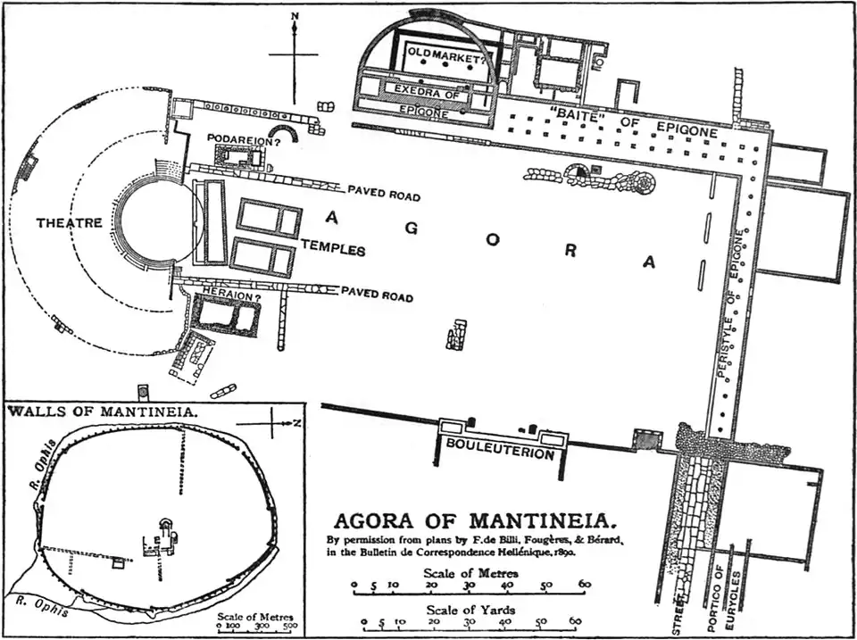 The site was excavated by M. Fougères, of the French School at Athens, in 1888. The plan of the agora and adjacent buildings has been recovered, and the walls have been completely investigated. The town was situated in an unusual position for a Greek city, on a flat marshy plain, and its walls form a regular ellipse about 21/2 m. in circumference. When the town was first formed in 470 B.C. by the “synoecism” of the neighbouring villages, the river Ophis flowed through the midst of it, and the Spartan king Agesipolis dammed it up below the town and so flooded out the Mantineians and sapped their walls, which were of unbaked brick. Accordingly, when the city was rebuilt in 370 B.C., the river Ophis was divided into two branches, which between them encircled the walls; and the walls themselves were constructed to a height of about 3 to 6 feet of stone, the rest being of unbaked brick. These are the walls of which the remains are still extant. There are towers about every 80 ft.; and the gates are so arranged that the passage inwards usually runs from right to left, and so an attacking force would have to expose its right or shieldless side. Within the walls the most conspicuous landmark is the theatre, which, unlike the majority of Greek theatres, consists entirely of an artificial mound standing up from the level plain. Only about a quarter of its original height remains. Its scena is of rather irregular shape, and borders one of the narrow ends of the agora. Close to it are the foundations of several temples, one of them sacred to the hero Podaros. The agora is of unsymmetrical form; its sides are bordered by porticoes, interrupted by streets, like the primitive agora of Elis as described by Pausanias, and unlike the regular agoras of Ionic type. Most of these porticoes were of Roman period—the finest of them were erected, as we learn from inscriptions, by a lady named Epigone: one, which faced south, had a double colonnade, and was called the Βαίτη: close to it was a large exedra. The foundations of a square market-hall of earlier date were found beneath this. On the opposite side of the agora was an extensive Bouleuterion or senate-house. Traces remain of paved roads both within the agora and leading out of it; but the whole site is now a deserted and feverish swamp. The site is interesting for comparison with Megalopolis; the nature of its plan seems to imply that its main features must survive from the earlier “synoecism” a century before the time of Epaminondas.