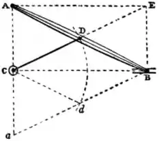 § 123. Energy distributed between two Bodies: Projection and Propulsion.—Hitherto the effort by which a machine is moved has been treated as a force exerted between a movable body and a fixed body, so that the whole energy exerted by it is employed upon the movable body, and none upon the fixed body. This conception is sensibly realized in practice when one of the two bodies between which the effort acts is either so heavy as compared with the other, or has so great a resistance opposed to its motion, that it may, without sensible error, be treated as fixed. But there are cases in which the motions of both bodies are appreciable, and must be taken into account—such as the projection of projectiles, where the velocity of the recoil or backward motion of the gun bears an appreciable proportion to the forward motion of the projectile; and such as the propulsion of vessels, where the velocity of the water thrown backward by the paddle, screw or other propeller bears a very considerable proportion to the velocity of the water moved forwards and sideways by the ship. In cases of this kind the energy exerted by the effort is distributed between the two bodies between which the effort is exerted in shares proportional to the velocities of the two bodies during the action of the effort; and those velocities are to each other directly as the portions of the effort unbalanced by resistance on the respective bodies, and inversely as the weights of the bodies.