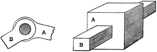 § 3. Composition of a Structure, and Connexion of its Pieces.—A structure is composed of pieces,—such as the stones of a building in masonry, the beams of a timber frame-work, the bars, plates and bolts of an iron bridge. Those pieces are connected at their joints or surfaces of mutual contact, either by simple pressure and friction (as in masonry with moist mortar or without mortar), by pressure and adhesion (as in masonry with cement or with hardened mortar, and timber with glue), or by the resistance of fastenings of different kinds, whether made by means of the form of the joint (as dovetails, notches, mortices and tenons) or by separate fastening pieces (as trenails, pins, spikes, nails, holdfasts, screws, bolts, rivets, hoops, straps and sockets.)