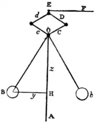 In finding the position in which the bob will revolve with a given angular velocity, a, for most practical cases connected with machinery the mass of the rod may be considered as insensible compared with that of the bob. Let the bob be a sphere, and from the centre of that sphere draw BH = y perpendicular to OA. Let OH = z; let W be the weight of the bob, F its centrifugal force. Then the condition of its steady revolution is W : F :: z : y; that is to say, y/z = F/W = yα2/g; consequently