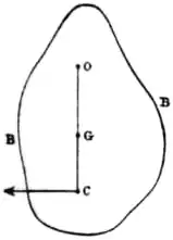 Thus is determined the position of the centre of percussion C, corresponding to the axis of rotation O. It is obvious from this equation that, for an axis of rotation parallel to O traversing C, the centre of percussion is at the point where the perpendicular OG meets O.