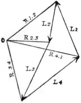 According to a well-known principle of statics, because the loads or external pressures P1L1, &c., balance each other, they must be proportional to the sides of a closed polygon drawn respectively parallel to their directions. In fig. 87 construct such a polygon of loads by drawing the lines L1, &c., parallel and proportional to, and joined end to end in the order of, the gross loads on the pieces of the structure. Then from the proportionality and parallelism of the load and the two resistances applied to each piece of the structure to the three sides of a triangle, there results the following theorem (originally due to Rankine):—