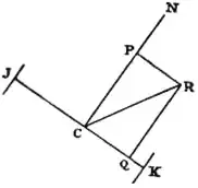 § 14. Condition of Stability of Friction.—If the resistance to be exerted at a joint is always perpendicular to the surfaces which abut at and form that joint, there is no tendency of the pieces to be displaced by sliding. If the resistance be oblique, let JK (fig. 89) be the joint, C its centre of resistance, CR a line representing the resistance, CN a perpendicular to the joint at the centre of resistance. The angle NCR is the obliquity of the resistance. From R draw RP parallel and RQ perpendicular to the joint; then, by the principles of statics, the component of the resistance normal to the joint is—