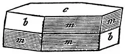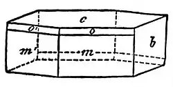 Mineralogical Characters.—The micas are characterized by a very easy cleavage in a single direction and by the high degree of flexibility, elasticity and toughness of the extremely thin cleavage flakes. They all crystallize in the monoclinic system, often, however, in forms closely resembling those of the rhombohedral or orthorhombic systems. Crystals have usually the form of hexagonal or rhomb-shaped scales, plates or prisms, with plane angles of 60° and 120°, and, with the exception of the basal planes, are only rarely bounded by smooth and well-defined faces. The crystal represented in fig. 1 is bounded by the basal pinacoid c (001) parallel to which is the perfect cleavage, the clinopinacoid b (010) parallel to the plane of symmetry, and the pyramids m (221) and o (112). The angles between these pyramids and the basal plane are 851/2° and 73° respectively. The prism (110) at 90° from the basal plane is not developed as a crystal face, but is a plane of twinning, the two individuals of the twin being united parallel to the basal plane (fig. 2). The different species of mica have very nearly the same forms and interfacial angles, and they not infrequently occur intergrown together in parallel position. The best developed crystals are those of Vesuvian biotite.