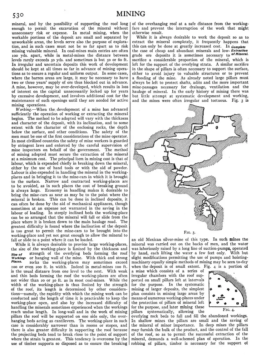 MINING, the general term for the working of deposits of valuable mineral. The term[1] is not limited to underground operations, but includes also surface excavations, as in placer mining and open-air workings of coal and ore deposits by methods similar to quarrying, and boring operations for oil, natural gas or brine. Mining may be subdivided into the operations of prospecting or search for minerals, exploration and development, work preparatory to active operations, and working. The latter includes not only the actual excavation of the mineral, but also haulage and hoisting by which it is brought to the surface, timbering and other means of supporting the excavations, and the drainage and ventilation of mines. Finally, under the heads of administration, mine valuation, mining education, accidents, hygiene and mining law, will be discussed matters having important bearing on mining operations. Special methods of mining are dealt with in the separate articles on Coal, Gold, and other minerals and metals. Quarrying and Ore-dressing, which may be considered as branches of mining, are also discussed in separate articles.