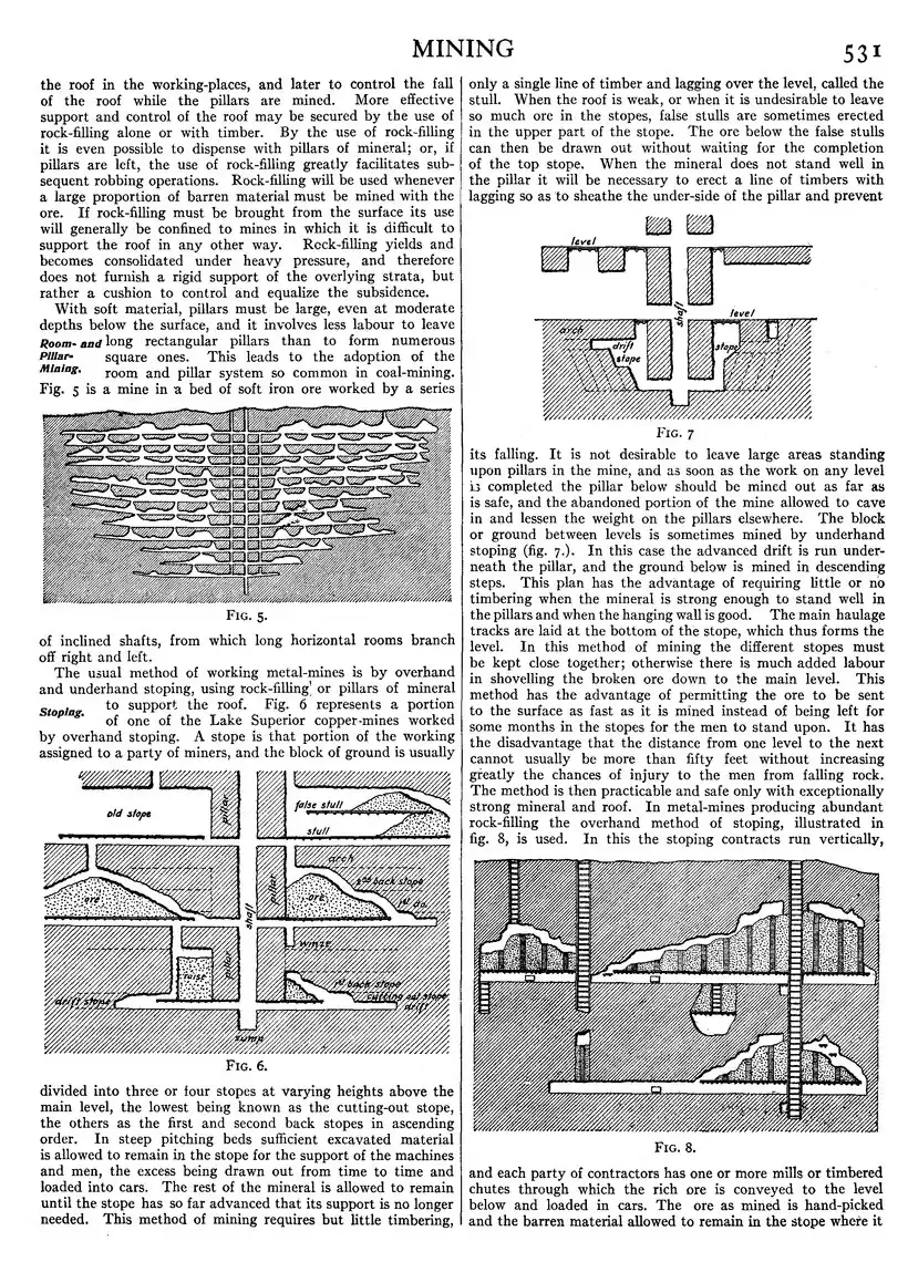 The usual method of working metal-mines is by overhand and underhand stoping, using rock-filling or pillars of mineral to support the roof. Fig. 6 represents a portion of one of the Lake Superior copper-mines worked by overhand stoping. A stope is that portion of the working assigned to a party of miners, and the block of ground is usually Stoping. divided into three or four stopes at varying heights above the main level, the lowest being known as the cutting-out stope, the others as the first and second back stopes in ascending order.