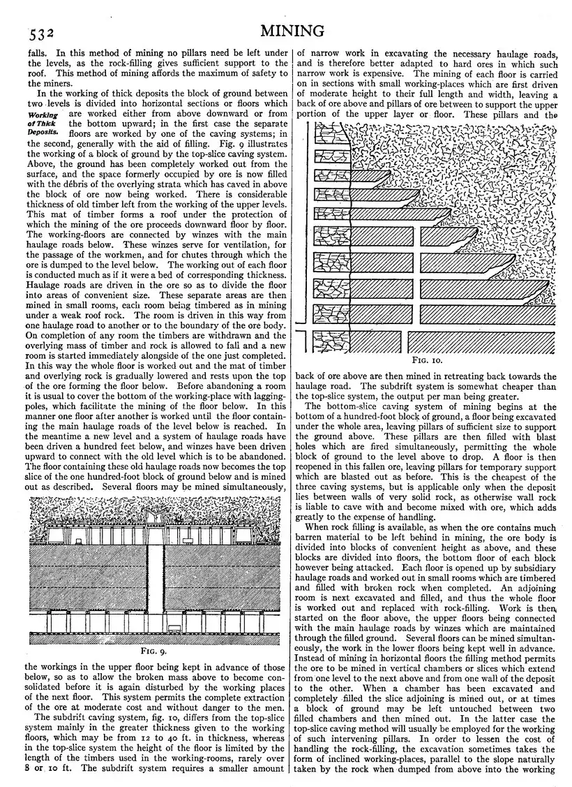 When rock filling is available, as when the ore contains much barren material to be left behind in mining, the ore body is divided into blocks of convenient height as above, and these blocks are divided into floors, the bottom floor of each block however being attacked. Each floor is opened up by subsidiary haulage roads and worked out in small rooms which are timbered and filled with broken rock when completed. An adjoining room is next excavated and filled, and thus the whole floor is worked out and replaced with rock-filling. Work is then. started on the floor above, the upper floors being connected with the main haulage roads by winzes which are maintained through the filled ground. Several floors can be mined simultaneously, the work in the lower floors being kept well in advance. Instead of mining in horizontal floors the filling method permits the ore to be mined in vertical chambers or slices which extend from one level to the next above and from one wall of the deposit to the other. When a chamber has been excavated and completely filled the slice adjoining is mined out, or at times a block of ground may be left untouched between two filled chambers and then mined out. In the latter case the top-slice caving method will usually be employed for the working of such intervening pillars. In order to lessen the cost of handling the rock-filling, the excavation sometimes takes the form of inclined working-places, parallel to the slope naturally taken by the rock when dumped from above into the working place. This method of mining and filling can be used when the work is done in horizontal floors or in transverse chambers. In the United States the Nevada square set system of timbering is used in Connexion with rock filling (fig. 11). The use of the heavy timbers and continuous framing which characterize this system facilitates greatly the work of mining and maintaining the haulage roads on the different floors, and gives more rigid support to the unmined portions of the block of ground above. These advantages compensate for the greater first cost. Where each floor is timbered by itself with light timbers, as is the practice on the continent of Europe, the consolidation of the rock-filling under pressure gives rise to considerable subsidence of the unmined ore, which has frequently settled 20 ft. or more before the upper part of the block is reached. This occasions much added expense in the maintenance and retimbering of the haulage roads on the upper floors. The shrinkage of the rock-filling and the settlement of the workings can be greatly lessened by the use of hard rock with a minimum of fine stuff; but even so the advantage lies with the American system of timbering.