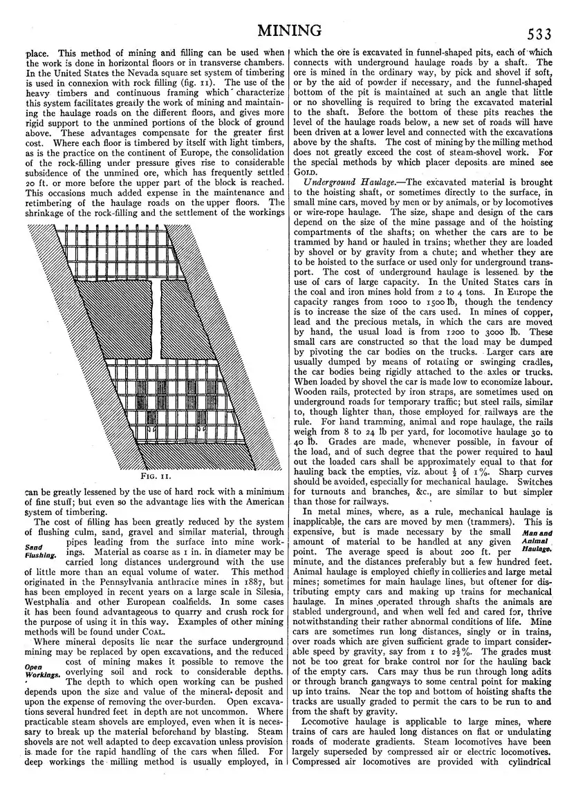 Underground Haulage.—The excavated material is brought to the hoisting shaft, or sometimes directly to the surface, in small mine cars, moved by men or by animals, or by locomotives or wire-rope haulage. The size, shape and design of the cars depend on the size of the mine passage and of the hoisting compartments of the shafts; on whether the cars are to be trammed by hand or hauled in trains; whether they are loaded by shovel or by gravity from a chute; and whether they are to be hoisted to the surface or used only for underground transport. The cost of underground haulage is lessened. by the use of cars of large capacity. In the United States cars in the coal and iron mines hold from 2 to 4 tons. In Europe the capacity ranges from 1000 to 1500 ℔, though the tendency is to increase the size of the cars used. In mines of copper, lead and the precious metals, in which the cars are moved by hand, the usual load is from 1200 to 3000 ℔. These small cars are constructed so that the load may be dumped by pivoting the car bodies on the trucks. Larger cars are usually dumped by means of rotating or swinging cradles, the car bodies being rigidly attached to the axles or trucks. When loaded by shovel the car is made low to economize labour. Wooden rails, protected by iron straps, are sometimes used on underground roads for temporary traffic; but steel rails, similar to, though lighter than, those employed for railways are the rule. For hand tramming, animal and rope haulage, the rails weigh from 8 to 24 ℔ per yard, for locomotive haulage 30 to 40 ℔. Grades are made, whenever possible, in favour of the load, and of such degree that the power required to haul out the loaded cars shall be approximately equal to that for hauling back the empties, viz. about 1/2 of 1%. Sharp curves should be avoided, especially for mechanical haulage. Switches for turnouts and branches, &c., are similar to but simpler than those for railways.