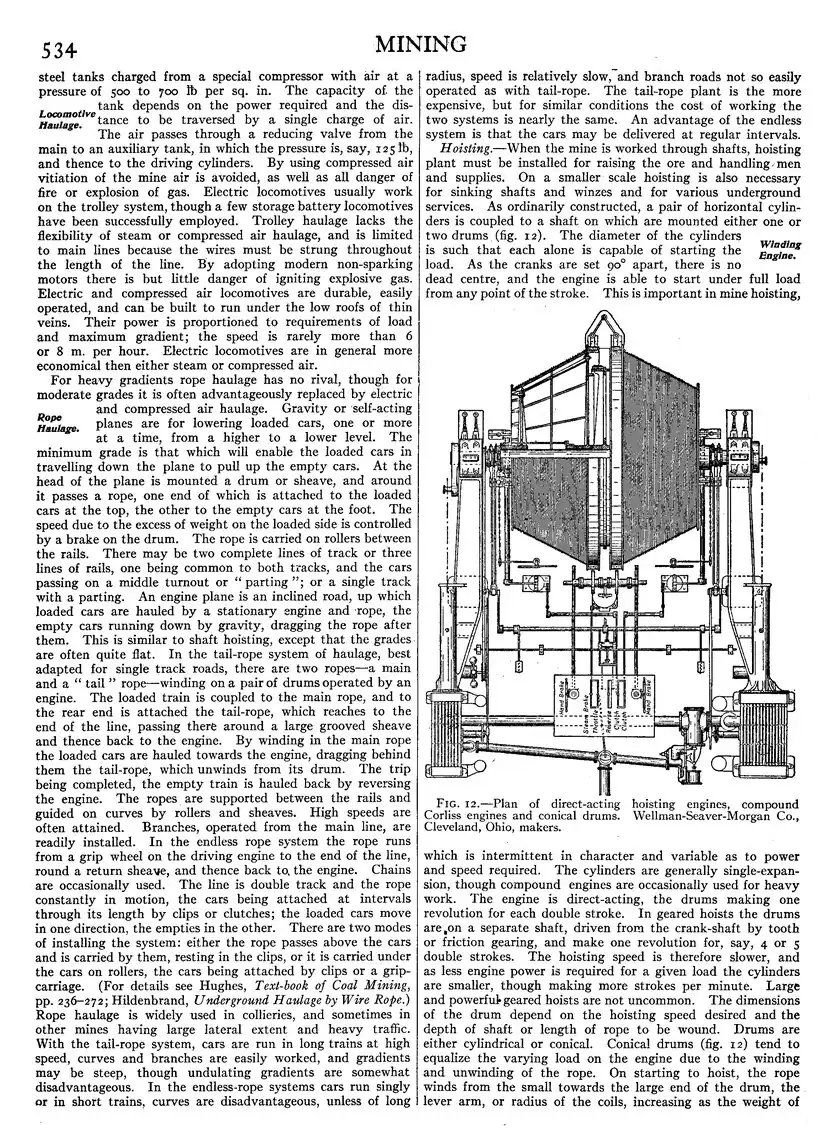 The cylinders are generally single-expansion, though compound engines are occasionally used for heavy work. The engine is direct-acting, the drums making one revolution for each double stroke. In geared hoists the drums are on a separate shaft, driven from the crank-shaft by tooth or friction gearing, and make one revolution for, say, 4 or 5 double strokes. The hoisting speed is therefore slower, and as less engine power is required for a given load the cylinders are smaller, though making more strokes per minute. Large and powerful geared hoists are not uncommon. The dimensions of the drum depend on the hoisting speed desired and the depth of shaft or length of rope to be wound. Drums are either cylindrical or conical. Conical drums (fig. 12) tend to equalize the varying load on the engine due to the winding and unwinding of the rope. On starting to hoist, the rope winds from the small towards the large end of the drum, the lever arm, or radius of the coils, increasing as the weight of rope decreases. A similar equalizing effect is obtained by the use of flat rope and reel, the rope winding on itself like a ribbon. Tapering ropes, tail-ropes suspended from the cages, and other means of equalization, are also employed. If, for a two-compartment shaft, a pair of drums (or a single wide drum) be keyed to the engine shaft, with the ropes wound in opposite directions, the hoisting is “in balance,” that is, the cages and cars counterbalance each other, so that the engine has to raise only the useful load of mineral, plus the rope. This arrangement allows no independence of movement: when the loaded cage is being hoisted the empty must be lowered. Independent drums, on the contrary, are loose upon their shaft, and are thrown on or off by tooth or friction clutches. The maximum load on the engine is thus greater and more is required than for fixed drums. Steam consumption is economized, whenever possible, by throwing in the clutches of both drums and hoisting in balance. Fixed drums are best for mines in which the hoisting is done chiefly from one level; independent drums when there are a number of different levels. Hoisting engines are provided with powerful brakes and frequently with reversing gear. In deep shafts hoisting speeds of 3000 or 3500 ft. per minute are often attained, occasionally as much as 5000 ft.
