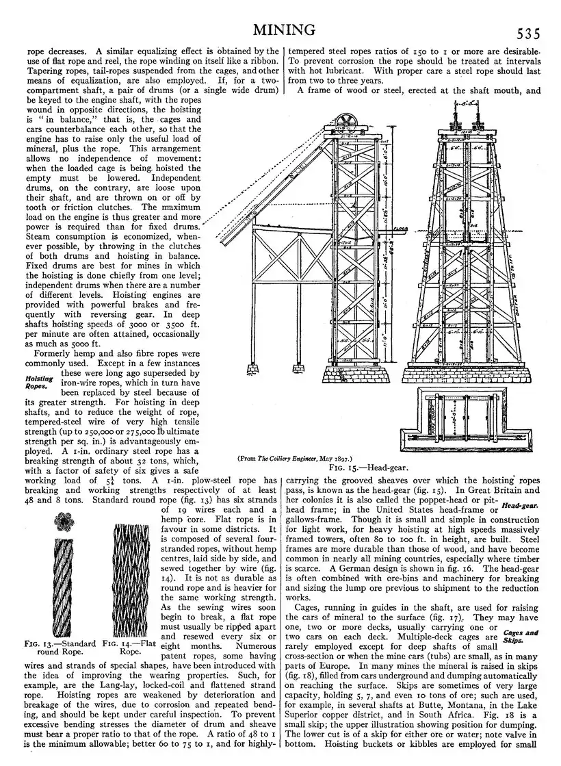 Formerly hemp and also fibre ropes were commonly used. Except in a few instances these were long ago superseded by iron-wire ropes, which in turn have been replaced by steel because of its greater strength. For hoisting in deep shafts, and to reduce the weight of rope, Hoisting Ropes. tempered-steel wire of very high tensile strength (up to 250,000 or 275,000 ℔ ultimate strength per sq. in.) is advantageously employed. A 1-in. ordinary steel rope has a breaking strength of about 32 tons, which, with a factor of safety of six gives a safe working load of 51/4 tons. A 1-in. plow-steel rope has breaking and working strengths respectively of at least 48 and 8 tons. Standard round rope (fig. 13) has six strands of 19 wires each and a hemp core.