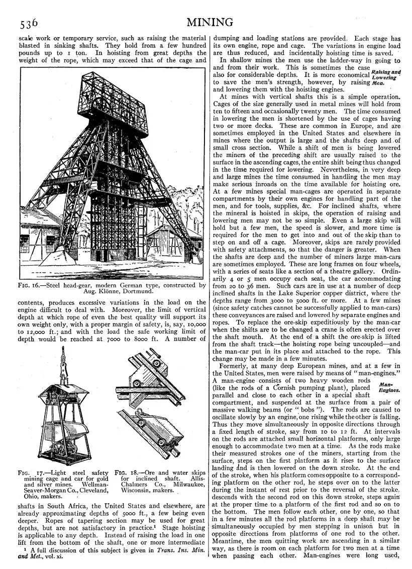 Formerly, at many deep European mines, and at a few in the United States, men were raised by means of “man-engines.” A man-engine consists of two heavy wooden rods (like the rods of a Cornish pumping plant), placed parallel and close to each other in a special shaft compartment, and suspended at the surface from a pair of Man-engines. massive walking beams (or “bobs”). The rods are caused to oscillate slowly by an engine, one rising while the other is falling. Thus they move simultaneously in opposite directions through a fixed length of stroke, say from 10 to 12 ft. At intervals on the rods are attached small horizontal platforms, only large enough to accommodate two men at a time. As the rods make their measured strokes one of the miners, starting from the surface, steps on the first platform as it rises to the surface landing and is then lowered on the down stroke. At the end of the stroke, when his platform comes opposite to a corresponding platform on the other rod, he steps over on to the latter during the instant of rest prior to the reversal of the stroke, descends with the second rod on this down stroke, steps again at the proper time to a platform of the first rod and so on to the bottom. The men follow each other, one by one, so that in a few minutes all the rod platforms in a deep shaft may be simultaneously occupied by men stepping in unison but in opposite directions from platforms of one rod to the other. Meantime, the men quitting work are ascending in a similar way, as there is room on each platform for two men at a time when passing each other. Man-engines were long used, but are now practically abandoned in both Great Britain and the United States, and few remain in any of the mining regions of the world. Their first cost is great and they are dangerous for new men, as they require constant alertness, presence of mind, and a certain knack in using them. See Trans. Inst. Min. and Met. xi. 334, 345, 380, &c.; also Eng. and Min. Jour. (April 4, 1903), pp. 517 and 518.