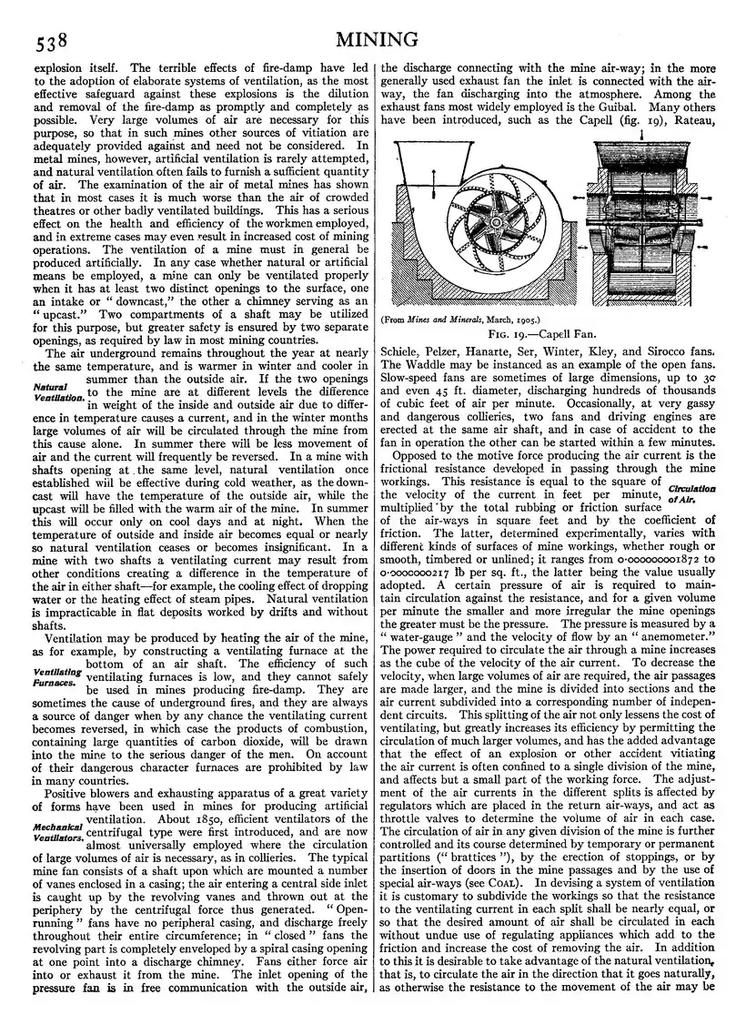 Positive blowers and exhausting apparatus of a great variety of forms have been used in mines for producing artificial ventilation. About 1850, efficient ventilators of the centrifugal type were first introduced, and are now almost universally employed where the circulation of large volumes of air is necessary, as in collieries. The typical Mechanical ventilators. mine fan consists of a shaft upon which are mounted a number of vanes enclosed in a casing; the air entering a central side inlet is caught up by the revolving vanes and thrown, out at the periphery by the centrifugal force thus generated. “Open-running” fans have no peripheral casing, and discharge freely throughout their entire circumference; in “closed” fans the revolving part is completely enveloped by a spiral casing opening at one point into a discharge chimney. Fans either force air into or exhaust it from the mine. The inlet opening of the pressure fan is in free communication with the outside air, the discharge connecting with the mine air-way; in the more generally used exhaust fan the inlet is connected with the airway, the fan discharging into the atmosphere. Among the exhaust fans most widely employed is the Guibal. Many others have been introduced, such as the Capell (fig. 19), Rateau, Schiele, Pelzer, Hanarte, Ser, Winter, Kley, and Sirocco fans.