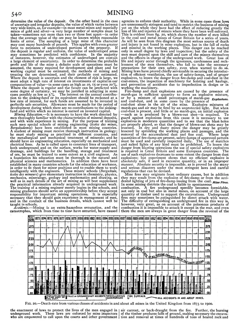 Accidents.—Mining is an extra-hazardous occupation, and the catastrophes, which from time to time have occurred, have caused the enactment of laws to protect the lives of the men engaged in underground work. These laws are enforced by mine inspectors who are empowered to call upon the courts and other government agencies to enforce their authority. While in some cases these laws are unnecessarily stringent and tend to restrict the business of mining yet on the whole they have had the effect of reducing greatly the loss of life and injuries of miners where they have been well enforced. This is evident from fig. 20, which shows the number of men killed in the coal and metal mines of Great Britain for a series of years. As will be seen from this diagram the most serious source of death and injury is not found in mine explosions, but in the fall of rocks and mineral in the working places. This danger can be reached only in small degree by laws and inspection; but the safety of the men must depend upon the skill and care of the miners themselves and the officers in charge of the underground work. Great loss of life and injury occur through the ignorance, carelessness and recklessness of the men themselves. who fail to take the necessary precautions for their own safety, even when warned to do so. Mining laws have proved chiefly serviceable in securing the introduction of efficient ventilation, the use of safety-lamps, and of proper explosives, to lessen the danger from tire-damp and coal-dust in the coal-mines, the inspection of machinery for hoisting and haulage, and prevention of accidents due to imperfection in design or in working the machinery.