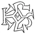 of the Frankish kings also took the form of a monogram. The accompanying monogram, from a coin of Charles the Bald, is a good example of a “perfect” monogram, in which all the letters of the name Karolus can be traced (see Diplomatic and Autograph). The most famous of monograms is that known as the “Sacred Monogram,” formed by the conjunction of the two initial letters of Χριστός, Christ. The most usual form of this is the symbol ⳩, and sometimes the α (alpha) and ω (omega) of the Apocalypse were placed on either side of it. The symbol was incorporated in the Labarum (q.v.) when the imperial standard was Christianized. The interlaced I.H.S. (also called “The Sacred Monogram”) apparently possesses no great antiquity; it is said to have been the creation of St Bernard of Siena in the middle of the 15th century. Monograms or ciphers were often used by the early printers as devices, and are of importance in fixing the identity of early printed books. Similar devices have been used by painters and engravers. The middle ages were, indeed, extremely prolific in the invention of ciphers alike for ecclesiastical, artistic and commercial use. Every great personage, every possessor of fine taste, every artist, had his monogram. The mason’s mark also was, in effect, a cipher. As the merchant had as a rule neither right nor authority to employ heraldic emblems, he therefore fell back upon plain simple letters arranged very much in monogram form. These “merchants’ marks” generally took the form of a monogram of the owner’s initials together with a private device. They nearly always contain a cross, either as a protection against storms or other catastrophes, or as a Christian mark to distinguish their goods from Mahommedan traders in the East. There is a fine example of a 16th century gold ring with a merchant’s mark in the British Museum. One of the most famous of secular monograms is the interlaced “H.D.” of Henri II. and Diane de Poitiers. Upon every building which that king erected it was sown profusely; it was stamped upon the buildings in the royal library, together with the bow, the quiver and the interlocked crescents of Diana. It has been argued that “H.D.” is a misreading of “H.C.,” which would naturally point to husband and wife; but the question is set at rest by the fact that Henri II. sometimes signed his letters to Diane with this very monogram. Henri IV. invented a punning cipher for his mistress Gabrielle d’Estrées, the surname being represented by a capital S. with a trait, or stroke through it.