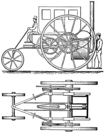 Light Vehicles.—The first practical steam carriage was made by Richard Trevithick in 1802 (fig. 1), though Cugnot had produced a rudimentary one in France in 1769; but very little was done in this direction until 1824, from which date a number of these vehicles were constructed and used with considerable success, taking the form of stage coaches propelled by steam, and weighing some 3 or 4 tons unloaded. Some of these ran regular passenger services, notably between Cheltenham and Gloucester, attaining average speeds of 10 to 14 m. per hour; but great opposition was met with owing to the narrow prejudice of those whose interests related to horse-haulage, and every obstruction was offered in the shape of prohibitive tolls and legislative enactments. The result was that steam carriages were driven off the roads in favour of railways, although the select committee of the House of Commons appointed in 1831 to inquire into the subject reported completely in favour of their adoption (as did also that of 1873). In 1861 the first Locomotives on Highways Act was passed, but the crushing blow came in 1865, when the legislature prescribed (1) that the number of persons required to drive the locomotive should be increased to three; (2) that a man should precede with a red flag; (3) that the maximum limit of speed should be reduced to 4 m. per hour; and (4) that they should be forbidden ever to blow off steam, &c. These restrictions were confirmed rather than relieved by the 1878 act. Although these acts were created to deal with heavy traction, the famous 1881 appeal in the court of queen’s bench placed every type of self-propelled vehicle, from a traction engine down to Bateman’s steam tricycle, under their narrow limitations. This resulted in the development of the heavy traction engine, and light motor vehicles were little more heard of in Great Britain. There were a few exceptions, however, notably the steam vehicles of Rickett (1860), Carrett (1861), Tangye (1862), Yarrow (1862), Holt (1866), Todd (1870), Perkins (1870), Mackenzie (1875) and Blackburn (1878), and some electrical carriages made by Elwell (1884), Ward (1886) and Volk (1888). An important departure was that of Butler, who constructed in 1885 what is believed to be the first vehicle (a tricycle) propelled by an internal combustion engine in England (fig. 2); he used the vapour of benzoline exploded electrically. Later, Roots successfully employed heavy oil, as did Knight. The chief prohibitory clauses of the acts were repealed in 1896, when the development of the internal-combustion engine had opened up entirely new prospects and suggested new possibilities.