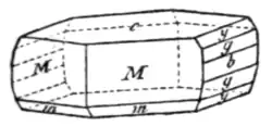 MUSCOVITE, a rock-forming mineral belonging to the mica group (see Mica). It is also known as potash-mica, being a potassium, hydrogen and aluminium orthosilicate, H2KAl3(SiO4)3. As the common white mica obtainable in thin, transparent cleavage sheets of large size it was formerly used in Russia for window panes and known as “Muscovy glass”; hence the name Muscovite, proposed by J. D. Dana in 1850. It crystallizes in the monoclinic system; distinctly developed crystals, however, are rare and have the form of rough six-sided prisms or plates: thin scales without definite crystal outlines are more common. The most prominent feature is the perfect cleavage parallel to the basal plane (𝑐 in the figure), on which the lustre is