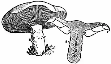 Sometimes cases of poisoning follow the consumption of what have really appeared to gardeners to be true bed-mushrooms, and to country folks as small horse mushrooms. The case is made more complicated by the fact that these highly poisonous forms now and then appear upon mushroom-beds to the exclusion of the mushrooms. This dangerous counterfeit is A. fastibilis, or sometimes A. crustuliniformis, a close ally if not indeed a mere variety of the first. A description of one will do for both, A. fastibilis being a little the more slender of the two. Both have fleshy caps, whitish, moist and clammy to the touch; instead of a pleasant odour, they have a disagreeable one; the stems are ringless, or nearly so; and the gills, which are palish-clay-brown, distinctly touch and grow on to the solid or pithy stem. These two fungi usually grow in woods, but sometimes in hedges and in shady places in meadows, or even, as has been said, as invaders on mushroom-beds. The pale clay-coloured gills, offensive odour, and clammy or even viscid top are decisive characters. A reference to the accompanying illustration (fig. 2), which is about one-half natural size, will give a good idea of A. fastibilis; the difference in the nature of the attachment of the gills near the stem is seen at r, the absence of a true ring at s, and of a pendent frill at t. The colour, with the exception of the gills, is not unlike that of the mushroom. In determining fungi no single character must be relied upon as conclusive, but all the characters must be taken together. Sometimes a beautiful, somewhat slender, fungus peculiar to stumps in woods is mistaken for the mushroom in A. cervinus; it has a tall, solid, white, ringless stem and somewhat thin brown cap, furnished underneath with beautiful rose-coloured gills, which are free from the stem as in the mushroom, and which never turn black. It is probably a poisonous plant, belonging, as it does, to a dangerous cohort. Many other species of Agaricus more or less resemble A. campestris, notably some of the plants found under the sub-genera Lepiota, Volvaria, Pholiota and Psalliota; but when the characters are noted they may all with a little care be easily distinguished from each other. The better plan is to discard at once all fungi which have not been gathered from open pastures; by this act alone more than nine-tenths of worthless and poisonous species will be excluded.
