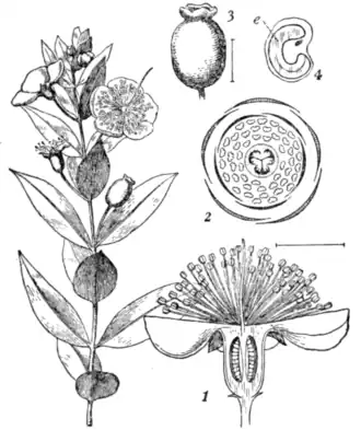 It is a low-growing, evergreen shrub, with opposite leaves, varying in dimensions, but always small, simple, dark-green, thick in texture, and studded with numerous receptacles for oil. When the leaf is held up to the light it appears as if perforated with pinholes owing to the translucency of these oil-cysts. The fragrance of the plant depends upon the presence of this oil. Another peculiarity of the myrtle is the existence of a prominent vein running round the leaf within the margin. The flowers are borne on short stalks in the axils of the leaves. The flower-stalk is dilated at its upper end into a globose or ovoid receptacle enclosing the 2- to 4-partitioned ovary. From its margin proceed the five sepals, and within them the five rounded, spoon-shaped, spreading, white petals. The stamens spring from the receptacle within the petals and are very numerous, each consisting of a slender white filament and a small yellow two-lobed anther. The style surmounting the ovary is slender, terminating in a small button-like stigma. The fruit is a purplish berry, consisting of the receptacle and the ovary blended into one succulent investment enclosing very numerous minute seeds. The embryo-plant within the seed is usually curved. In cultivation many varieties are known, dependent on variations in the size and shape of the leaves, the presence of so-called double flowers, &c. The typical species is quite hardy in the south of England. The Chilean species, M. Ugni, a shrub with ovate, dark green leaves and white flowers succeeded by globular red or black glossy fruit with a pleasant smell and taste, is a greenhouse shrub, hardy in south-west Britain. The common myrtle is the sole representative in Europe of a large genus which has its headquarters in extra-tropical South America, whilst other members are found in Australia and New Zealand. The genus Myrtus also gives its name to a very large natural order, Myrtaceae, the general floral structure of which is like that of the myrtle above described, but there are great differences in the nature of the fruit or seed-vessel according as it is dry or capsular, dehiscent, indehiscent or pulpy; minor differences exist according to the way in which the stamens are arranged. The aromatic oil to which the myrtle owes its fragrance, and its use in medicine and the arts, is a very general attribute of the order, as may be inferred from the fact that the order includes, amongst other genera, Eucalyptus (q.v.), Pimenta and Eugenia (cloves). Myrtol, a constituent of myrtle oil, has been given in doses of 5–15 minims on sugar or in capsules for pulmonary tuberculosis, fetid bronchitis, bronchiectasis, and similar conditions. It appears to lessen expectoration in such cases. The leaves of Myrtus chekan are aromatic and expectorant, and have been used in chronic bronchitis.
