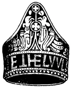 patterns are formed in gold with a background of niello. One with the name of Ethelwulf, king of Wessex (836–838), is now in the British Museum (see figure). Another in the Victoria and Albert Museum has the name of Alhstan, who was bishop of Sherborne from 823 to 867. The metal-workers of Ireland, whose skill was quite unrivalled, practised largely the art of niello from the 10th to the 12th century, and possibly even earlier. Fine croziers, shrines, fibulae, and other objects of Irish workmanship, most skilfully enriched with elaborate niello-work, exist in considerable numbers. From the 13th to the 16th century but little niello-work appears to have been produced in England. Two specimens have been found, one at Matlask, Norfolk, and the other at Devizes, which from the character of the design appear to be English. They are both of gold, and seem to be the covering plates of small pendant reliquaries about 1 in. long, dating about the end of the 15th century. One has a crucifix between St John the Baptist and a bishop; the other, that found at Devizes, has the two latter figures, but no crucifix.[6] It is, however, in Italy that the art of niello-work was brought to greatest perfection. During the whole medieval period it was much used to decorate church plate, silver altar-frontals, and the like: The magnificent frontals of Pistoia cathedral and the Florence baptistery are notable instances of this. During the 15th century, especially at Florence, the art of niello-work was practised by almost all the great artist-goldsmiths of that period. Apart from the beauty of the works they produced, this art had a special importance and interest from its having led the way to the invention of printing from engravings on metal plates (see Line-engraving). Vasari’s account of this invention, given in his lives of Pollaiuolo and Maso Finiguerra, is very interesting, but he is wrong in asserting that Maso was the first worker in niello who took proofs or impressions of his plates. An important work of this sort, described at length by Vasari and wrongly ascribed by him to Maso Finiguerra (q.v.), still exists in the Opera del Duomo at Florence. It is a pax with a very rich and delicate niello picture of the coronation of the Virgin; the composition is very full, and the work almost microscopic in minuteness; it was made in 1452. Impressions from it are preserved in the British Museum, the Louvre and other collections. The British Museum possesses the finest existing example of 15th-century German niello. It is a silver beaker, covered with graceful scroll-work, forming medallions, in which are figures of cupids employed in various occupations (see Shaw’s Dresses and Decorations of the Middle Ages, 1858, vol. ii.).