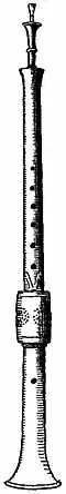 The chaunter of the bagpipe was a shawm, having the double reed concealed within an air-chamber, while the drones had single beating reeds concealed in the same manner. Mersenne calls both chalumeaux.[4] The cornemuse or chalemie of shepherds and peasants was of this kind, but a special cornemuse, used in the 17th century in concert with the hautbois de Poitou, had double reeds throughout in chaunter and drone. The hautbois de Poitou was a primitive oboe with the reed placed in a bulb, forming an air-chamber, having a raised slit at the top through which the performer breathed in compressed air; as the reed could not be controlled by the lips, it was impossible to play with expression on the hautbois de Poitou or to obtain the harmonic octaves; the compass was therefore limited. The kind of bagpipe (q.v.) known as Musette,[5] inflated by bellows, also had double reeds throughout in spite of having a cylindrical chaunter.