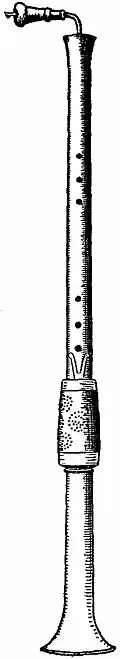 The alto Pommer was but slowly transformed: it was called in French “hautbois de chasse,” in Italian “oboe di caccia.” In the 18th century we find it more elegant in form, but with all the defects of the primitive instrument. The idea of bending the instrument into a half circular form to facilitate the handling is usually attributed to an oboist of Bergamo, one Jean Ferlendis, who was established at Salzburg at about 1760. This is obviously incorrect, since Ferlendis would then have been five years old.[15] It has been suggested that the fact of the instrument’s resembling a kind of hunting horn used at that time in England probably gained for it the name of “corno inglese,” which it still retains (“cor anglais” in French).[16] The first employment of it in the orchestra is referred to Gluck, who had two “cors anglais” in his Alceste, as played at Vienna in 1767. But it was not until 1808 that the cor anglais was first heard in the Paris opera; it was played by the oboist Vogt in Alexandre chez Apelle by Catel. The improvements in manufacture of this instrument closely followed those introduced in the oboe. The 18th century produced an intermediate oboe between (2) and (3), which was called hautbois d’amour, and was frequently employed by J. S. Bach. It was a third lower than the ordinary oboe, and was characterized by the pear-shaped bell with narrow aperture common to all wind instruments known as d’amour to which is due their veiled sweet quality. In the Spanish Cantigas, there are two Schalmeys with pear-shaped bells. This is in all probability the douçaine mentioned in the 13th and 14th-century romances. The oboe d’amore fell into disuse after the death of the great German composer. It has been resuscitated by the firm of C. Mahillon of Brussels, and reconstructed with the improvements of modern manufacture. A similar timbre was artificially produced in the oboe by means of mutes or sordini composed of hollow cones of wood, balls of paper,[17] pieces of sponge,[18] &c.