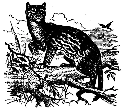 OCELOT (Mexican Flalocelotl, literally field-jaguar, from Flalli, field, and ocelotl, tiger, jaguar), an American member (Felis pardalis) of the family Felidae, ranging from Arkansas in the north to Paraguay. The species is subject to great racial variation. The fur has, however, a tawny yellow or reddish-grey ground colour, marked with black spots, aggregated in streaks and blotches, or in elongated rings enclosing areas rather darker than the general ground-colour. In the typical form the total length may reach 4 ft.; the average measurement of the head and body lies between 26 in. and 33 in., and of the tail between 11 in. and 15 in. The ocelot is essentially a forest cat, and a ready climber; its disposition is said to be fierce and bloodthirsty but in confinement it becomes tame and playful. In Asia the group is represented by the Tibetan Felis tristis.