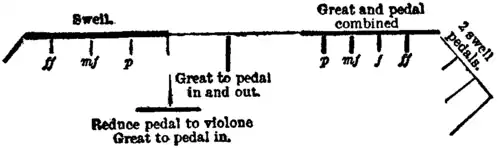 - ↑ As some difficulty has been felt as to what is here meant, an instance is given. The writer has heard a first-rate player emphasize the entrance of a chorale in the pedal (Mendelssohn’s 3rd sonata in A) by coupling the choir clarinet to the pedal. The effect was coarse and disagreeable, and would have been ridiculous if it had not been so ugly. It was clear, but not dignified.