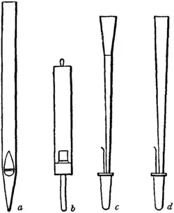 | Fig. 5.—𝑎, An open diapason; 𝑏, a stopped diapason; 𝑐, an oboe; and 𝑑, a trumpet—𝑐 and 𝑑 being forms of reed-pipes. | Fig. 6.—Mouthpieces in some- what greater detail. |