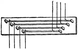 | Fig. 4.—A portion of the table as it appears from above, with the places for the sliders of the stops; the small circles show the holes for the wind. |