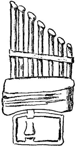 In order to convert the syrinx into a mechanically played instrument, the addition of the actuating principle of the bag-pipe was necessary. It is probable that in the earliest attempts the leather bag was actually retained and that the supply of wind was still furnished by the mouth through an insufflation pipe. Such an instrument is described and illustrated by Father Athanasius Kircher,[6] but his drawing should be accepted with reserve, as it was probably only an effort of the imagination to illustrate the text. In the instrument, which he calls the Magraketha or Mashrokitha of the Chaldees, the bag is described as being inside the wind-chest, the insufflation pipe being carried through a hole in the side of the box. Little wooden sliders manipulated by the fingers formed a primitive means of controlling the escape of the wind through any given pipe.