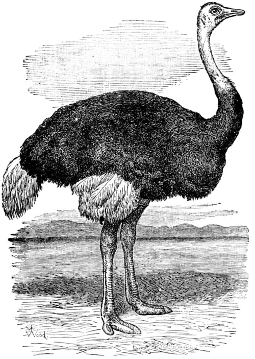 - ↑ By those whose experience is derived from the observation of captive ostriches this fact has been often disputed. But, the difference of circumstances under which they find themselves, and in particular their removal from the heat-retaining sands of the desert and its burning sunshine, is quite enough to account for the change of habit. Von Heuglin also (p. 933) is explicit on this point.