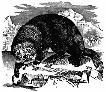 As the otter lives almost exclusively on fish, it is rarely met with far from water, and usually frequents the shores of brooks, rivers, lakes and, in some localities, the sea itself. It is a most expert swimmer and diver, easily overtaking and seizing fish in the water; but when it has captured its prey it brings it to shore to devour. When lying upon the bank, it holds the fish between its fore-paws, commences at the head and then eats gradually towards the tail, which it is said to leave. The female produces three to five young ones in March or April, and brings them up in a nest formed of grass or other herbage, usually placed in a hollow place in the bank of a river, or under the shelter of the roots of some overhanging tree. The otter is found in localities suitable to its habits throughout Great Britain and Ireland, though less abundantly than formerly, for, being destructive to fish, it is rarely allowed to live in peace when its haunts are discovered. Otter-hunting with packs of hounds of a special breed, and trained for the purpose, is a pastime in many parts of the country. It was formerly the practice to kill the otter with long spears, which the huntsmen carried; now the quarry is picked up and “tailed,” or run into by the pack.