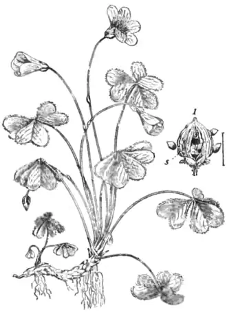 | Wood-sorrel (Oxalis Acetosella), 3/4 nat. size, 1. Fruit which has split open; the seeds are shot out by the elastic contractions of their outer coat, s. |
