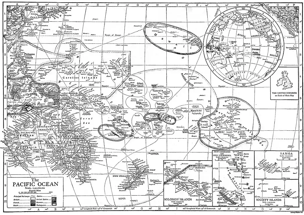 Bibliography.—For the results of the various voyages of explorers see their narratives, especially those of Captain Cook, and among the earlier Collections of voyages see especially Captain James Burney, Chronological History of the Discoveries in the South Sea or Pacific Ocean—from the earliest navigators to 1764—(London, 1803–1817). Of general works (which are few) see C. E. Mcinicke, Die Inseln des Stillen Oceans (Leipzig, 1875); F. H. H. Guillemard, Australasia, vol. ii., revised by A. H. Keane, in Stanford’s Compendium of Geography and Travel (London, 1908); and W. T. Brigham, Index to the Islands of the Pacific (Honolulu, 1900). Among other works (the majority of which deal only with parts of the region known to the writers from travel), see J. A. Moerenhout, Voyages aux Iles du Grand Ocean (1837); W. Ellis, Polynesian Researches (London, 1853); G. Turner, Nineteen Years in Polynesia (London, 1861); T. West, Ten Years in South Central Polynesia (London, 1865); J. Brenchley, Cruise of the “Curaçoa” among the South Sea Islands during 1865 (London, 1873); W. Coote, Western Pacific Islands (London, 1883); H. H. Romilly, The Western Pacific and New Guinea (London, 1887); H. Stonehewer Cooper, The Islands of the Pacific (London, 1888; earlier editions, 1880, &c., were under the title Coral Lands); F. J. Moss, Through Atolls and Islands (London, 1889); W. T. Wawn, The South Sea Islanders and the Queensland Labour Trade (1889); G. Haurigot, Les Établissements français en Océania (Paris, 1891); B. F. S. B. Powell, In Savage Isles and Settled Lands (London, 1892); “Sundowner,” Rambles in Polynesia (London, 1897); M. M. Shoemaker, Islands of the Southern Seas (New York, 1898); Joachim Graf Pfeil, Studien . . . aus der Südsee (Brunswick, 1899); Robert Louis Stevenson, In the South Seas (London, 1900); A. R. Colquhoun, The Mastery of the Pacific (London, 1902); G. Wegener, Deutschland in der Südsee (Bielefeld, 1903); A. Kramer, Hawaii, Ostmikronesien, und Samoa (Stuttgart, 1906); J. D. Rogers, Australasia, vol. vi. of the Historical Geography of the British Colonies, edited by Sir C. P. Lucas (Oxford, 1907); T. A. Coghlan, Statistical Account of the Seven Colonies of Australasia (Sydney). With especial reference to the natives and their languages see Sir G. Grey, Polynesian Mythology (London, 1855); W. Gill, Myths and Songs of the South Pacific (London, 1876); J. D. Lang, Origin and Migrations of the Polynesian Nation (Sydney, 1877); A. Lesson, Les Polynésiens (Paris, 1880 seq.); R. H. Codrington, The Melanesian Languages (Oxford, 1885); E. Reeves, Brown Men and Women (London, 1898); J. Gaggin, Among the Man-Eaters (London, 1899); A. C. Haddon, Head-hunters, Black, White and Brown (London, 1902); D.Macdonald, The Oceanic Languages: their Grammatical Structure, Vocabulary and Origin (London, 1907); J. Macmillan Brown, Maori and Polynesian (London, 1907), and the articles Polynesia; Melanesia. And with especial reference to natural history, J. D. Hooker, A Lecture on Insular Floras (London, 1868); E. Drake del Castillo, Remarques sur la flore de la Polynésie (Paris, 1890); H. B. Guppy, Observations of a Naturalist in the Pacific, 1896–1899 (London, 1903 seq.).