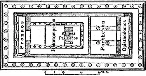 PARTHENON (Παρθενών), the name generally given, since the 4th century B.C., to the chief temple of Athena on the Acropolis at Athens (e.g. Demosthenes, c. Androt. 13, 76). The name is applied in the official inventories of the 5th and early 4th centuries to one compartment of the temple, and this was probably its original meaning. It is certainly to be associated with the cult of Athena Parthenos, “the Virgin,” though it is not clear why the name was given to this particular chamber.