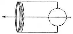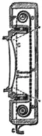 7. Moving Blade Central Shutters.—These shutters, in which two thin metal or ebonite plates or opaque curtains with round or rectangular apertures, or in other cases two curved blades, pass very quickly over each other in opposite directions, are largely used in many patterns fitted between the lenses of a combination or attached to them in front or behind. Formed of two single lateral shutters opening and closing in the centre of the lens aperture, they become central, the exposure taking place during the short period in which the openings are passing each other or the curved blades opening out and closing again. To obtain the greatest efficiency the size of the openings should correspond with the full aperture of the lens. If each plate moves as fast as a drop shutter the combination gives double the speed, corresponding to half the exposure. The sensitive plate will be most evenly and strongly illuminated when the leaves of the shutter work inside the lens near the diaphragm, as in Bausch and Lomb’s “Unicum” and other similar between-lens shutters, in general use (fig. 65). This necessitates the fitting of the lens to the shutter, but with adapters it is possible to fit other lenses.