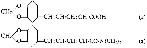 Oxidation with potassium permanganate converts piperic acid into piperonal, C8H6O3, and piperonylic acid, C8H6O4. The latter when heated with hydrochloric acid to 170°, or water to 200°, separates carbon with the formation of protocatechuic acid, 1⋅2-dioxy-3-benzoic acid, C6H3(OH)2COOH. Conversely, by heating protocatechuic acid with potash and methylene iodide, piperonylic acid was regained. These results show that piperonylic acid is the methylene ether of protocatechuic acid. Piperonal (q.v.) is the corresponding aldehyde. Piperic acid differs from piperonylic acid by the group C4H4, and it was apparent that these carbon atoms must be attached to the carbon atom which appears in the carboxyl group of piperonylic acid, for if they were directly attached to the benzene ring polycarboxylic acids would result in oxidation. The above formula for piperic acid was confirmed by its synthesis by A. Ladenburg and M. Scholtz (Ber., 1894, 27, p. 2958) from piperonyl acrolein (the condensation product of piperonal and acetaldehyde) and acetic acid. The synthesis of piperine follows from the interaction of piperyl chloride (formed from piperic acid and phosphorus pentachloride) and piperidine (L. Rugheimer, Ber., 1882, 15, p. 1390).